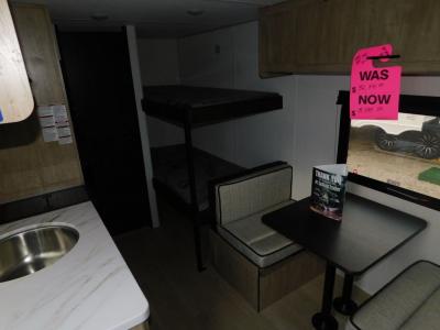 The whole family can sleep comfortably in this travel trailer! It has a set of bunk beds for the kids to sleep on, and you can sleep comfortably on the front queen bed with overhead cabinets and a shelf. The chef will enjoy preparing their best home cooked meals with the cooktop, and you can dine at the booth dinette. And the private bath onboard means you won't have to leave your camper in the middle of the night!